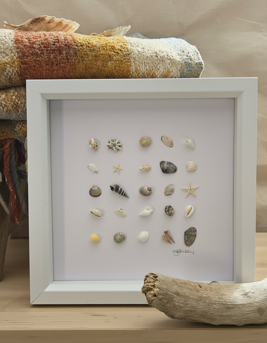Celebrating the joy of discovery along the shoreline, Gathered Tide brings together shells and starfish in a neat grid that recalls the treasures picked up on a beach walk. Some shells are hand-collected, others carefully chosen for colour and contrast — together forming a unique piece of coastal storytelling. Signed by hand and framed in white.